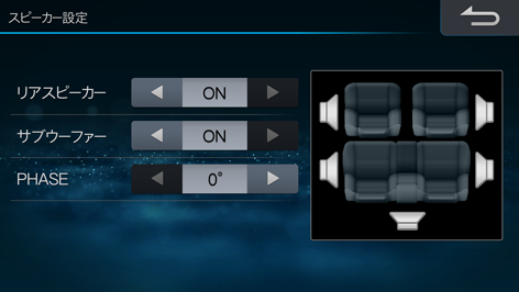 リアスピーカーとサブウーファーを接続する場合はONに設定してください(初期設定値はリアスピーカー「ON」、サブウーファー「OFF」、PHASE「0°」)。
