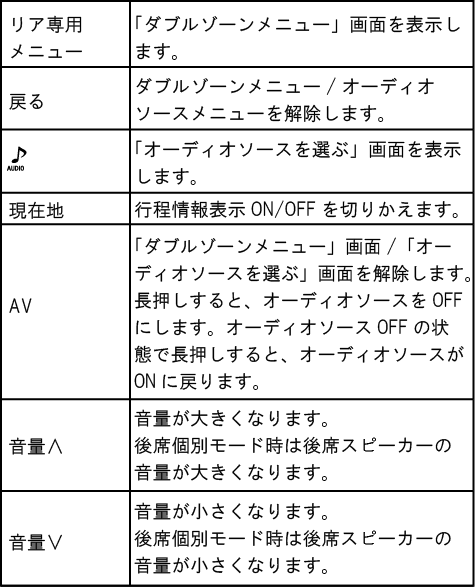 別売リモコン(RUE-RST02)を使用して、リアビジョン側から本機を操作することができます。後席表示設定を「オーディオソース」に設定してある場合や、後席個別モード時には、下記操作を行うことができます。一部操作はリアビジョン用ダブルゾーンメニューから操作を行います。