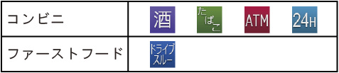 コンビニ、ファーストフードでは下記情報アイコン(「酒」「たばこ」「ATM」「24H」「ドライブスルー」)が画面右側の地図上に表示されます。