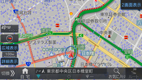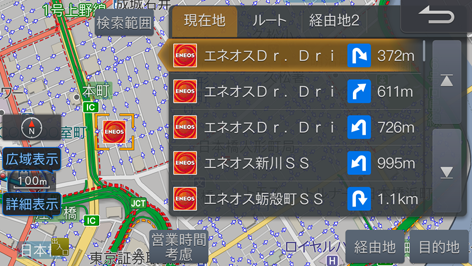 現在地・ルート・目的地周辺のよく使う施設(コンビニエンスストア(コンビニ)・ファーストフード・ファミリーレストラン・ガソリンスタンド・駐車場)を簡単に検索することができます。
