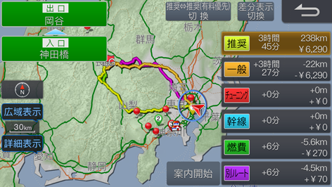 [推奨][一般][チューニング][幹線][燃費][別ルート]のいずれかにタッチすると、地図上に選択したルートが表示されます。