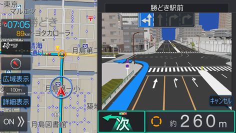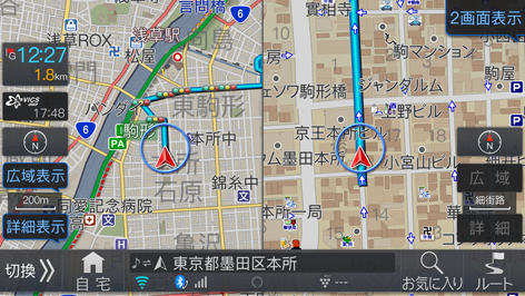 細街路を走行すると自動で2画面表示に切りかわり、右画面に25m市街地図を表示して細街路案内を行います。表示を解除するには[現在地]スイッチを押します。