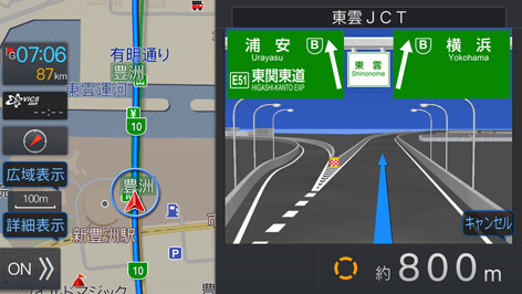 有料道路や高速道路を走行しているとき、情報がある分岐点(JCT)が近づくと、分岐点名称や方面名称が表示されます。