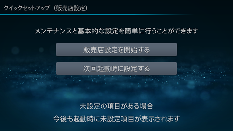 販売店設定は本機取り付け時に販売店で行いますので、通常は操作の必要はありません。クイックセットアップが初期化された場合や再設定が必要な場合は、本設定を行ってください。クイックセットアップ初期化後の初回起動時に設定画面が表示されます。
