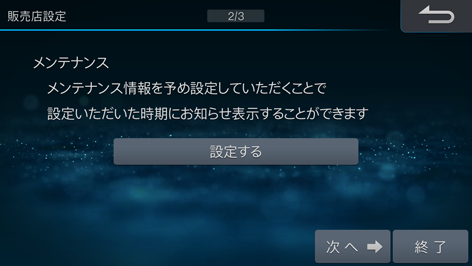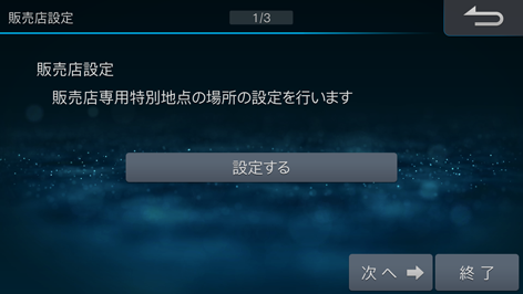 設定途中で[終了]にタッチすると、次回起動時にも販売店セットアップ画面が表示されます。