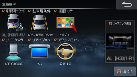 メーカー名を選択して[決定]にタッチし、続けて車種名とグレードを選択して[決定]にタッチします。