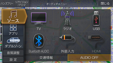 ルート案内の音声・映像はそのままでオーディオソースをOFFにできます。同乗者が寝ている時など、車室内を静かにしたい場合にご使用ください。