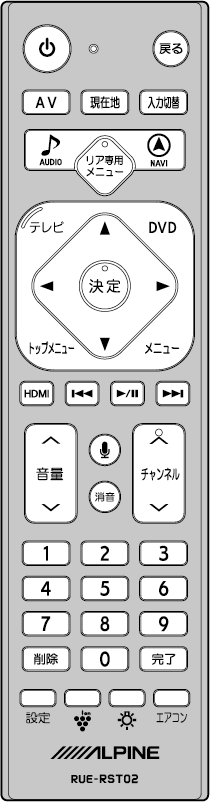 別売リモコン(RUE-RST02)を使用して、リアビジョン側から本機を操作することができます。後席表示設定を「オーディオソース」に設定してある場合や、後席個別モード時には、下記操作を行うことができます。一部操作はリアビジョン用ダブルゾーンメニューから操作を行います。